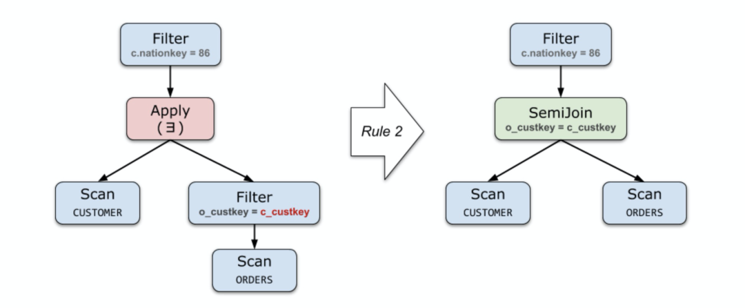 上文说到的 Relation - Expression - Relation 这种交替引用不仅执行性能堪忧,而且,对于优化器也是个麻烦的存在——我们的优化规则都是在匹配并且对 Relation 进行变换,而这里的子查询却藏在 Expression 里,令人无从下手。